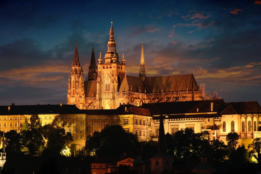 Entramos en nuestro cuarto y sin pensarlo un momento... como en el juego al que todos jugamos de pequeños al regresar de un día de playa y siempre gritábamos..."yo prime", te desnudas y te diriges al cuarto de baño, a tomar una ducha muy caliente, sobre todo, para calmar el cuerpo del no acostumbrado frío. Cuando sales, totalmente desnuda, te encuentras con un té casi hirviendo que he ido a buscar, sin que lo supieras, al bar del hotel. Lo tomamos muy calmadamente, sorbemos mientras acariciamos la taza sin decirnos apenas nada y haciendo gala de una perfecta sincronía.... al terminar, nos dirigimos a la cama. Hacemos el amor, más que por una necesidad sexual, por una afán de acercamiento, de relajar nuestros cuerpos y músculos exhaustos tras un intenso día de frío y cansancio. Nos movemos acompasadamente, sin prisas, como temiendo que el placer, que llegará, suponga el fin del momento. Cuando este se produce, nos mantenemos unidos, evitando que el calor que hemos generado se evapore. Solo el roce de nuestros labios supone el único movimiento. Te giras sobre ti misma y me das la espalda. Continuas unida a mi hasta que de repente... tomando el suave y liviano edredón para cubrirte... te diriges a la ventana y me llamas: - "Cariño, ven... han encendido las luces del castillo". Me acerco hasta donde estás y contemplo como el brillo de la imponente catedral y sus vidrieras de colores, lo inundan todo y el mismo reflejo que se posa sobre las aguas del Moldava, tiñe también de policromía tus bellos ojos marrones.
